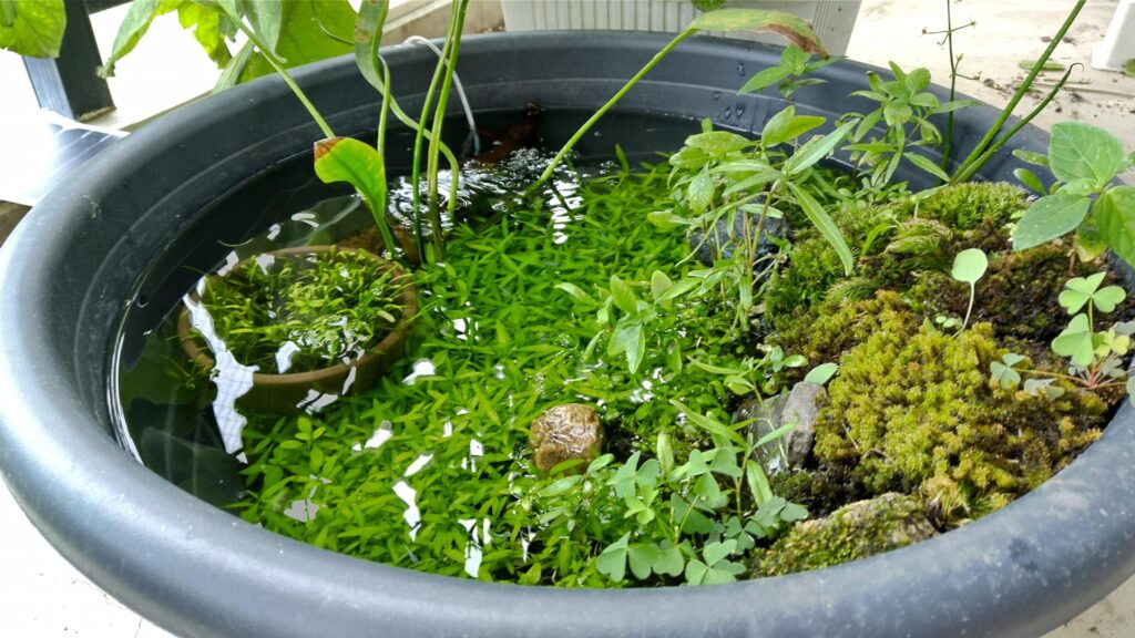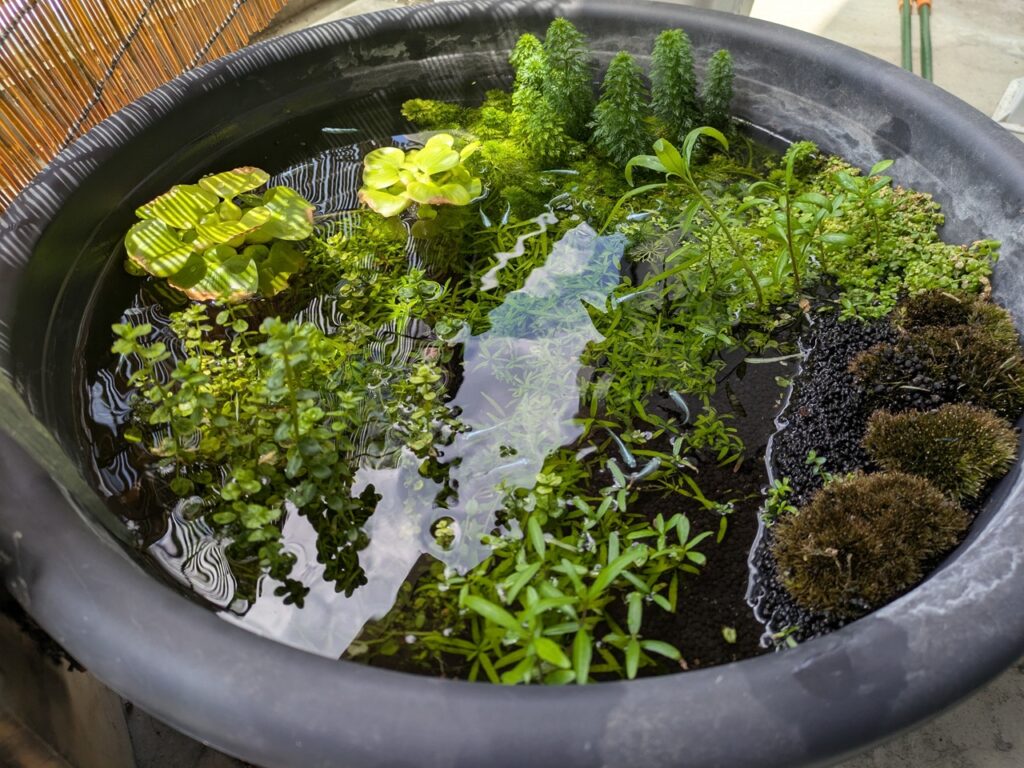 コケ・雑草の種類も多いし、全体的に青々とした元気な印象。今年は猛暑だったからかもしれないが、水生植物をいろいろ変えてみるのはやはり楽しい。