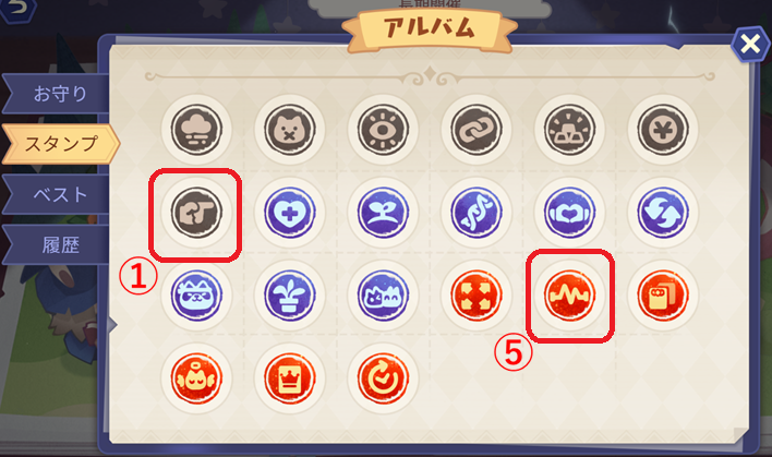所持お守りに複数あればあるほど効果が強くなり、4枚以上になってくると、通常パックからレアなお守りが出て、星も稼げるし、目当てのお守りも引きやすくなる。序盤はこのスタンプを集めるのが良さそう。