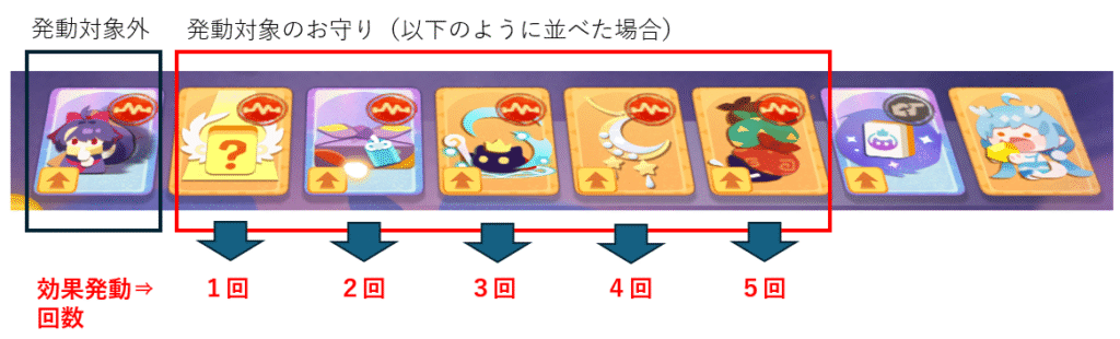 赤枠内は、伝導の印の効果対象のお守りで並べる必要がありますが、下図のように伝道の印がついたお守りで右に行くほど効果発動回数が多くなります。ウエイトトレーニングで鍛えた乗算係数を5回かけれるので、大変なスコアになります。
